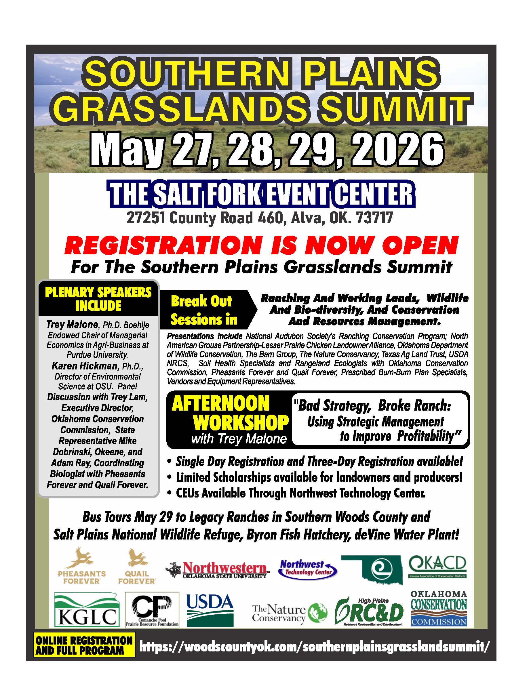 The Southern Plains Grasslands Summit is coming to Northwest Oklahoma May 27, 28, and 29, 2026, at The Salt Fork Event Center in Alva. This three day event brings together producers, government agencies, academia, conservation leaders, and industry partners for collaboration, innovation, and forward thinking solutions that support the future of working lands and native grasslands.